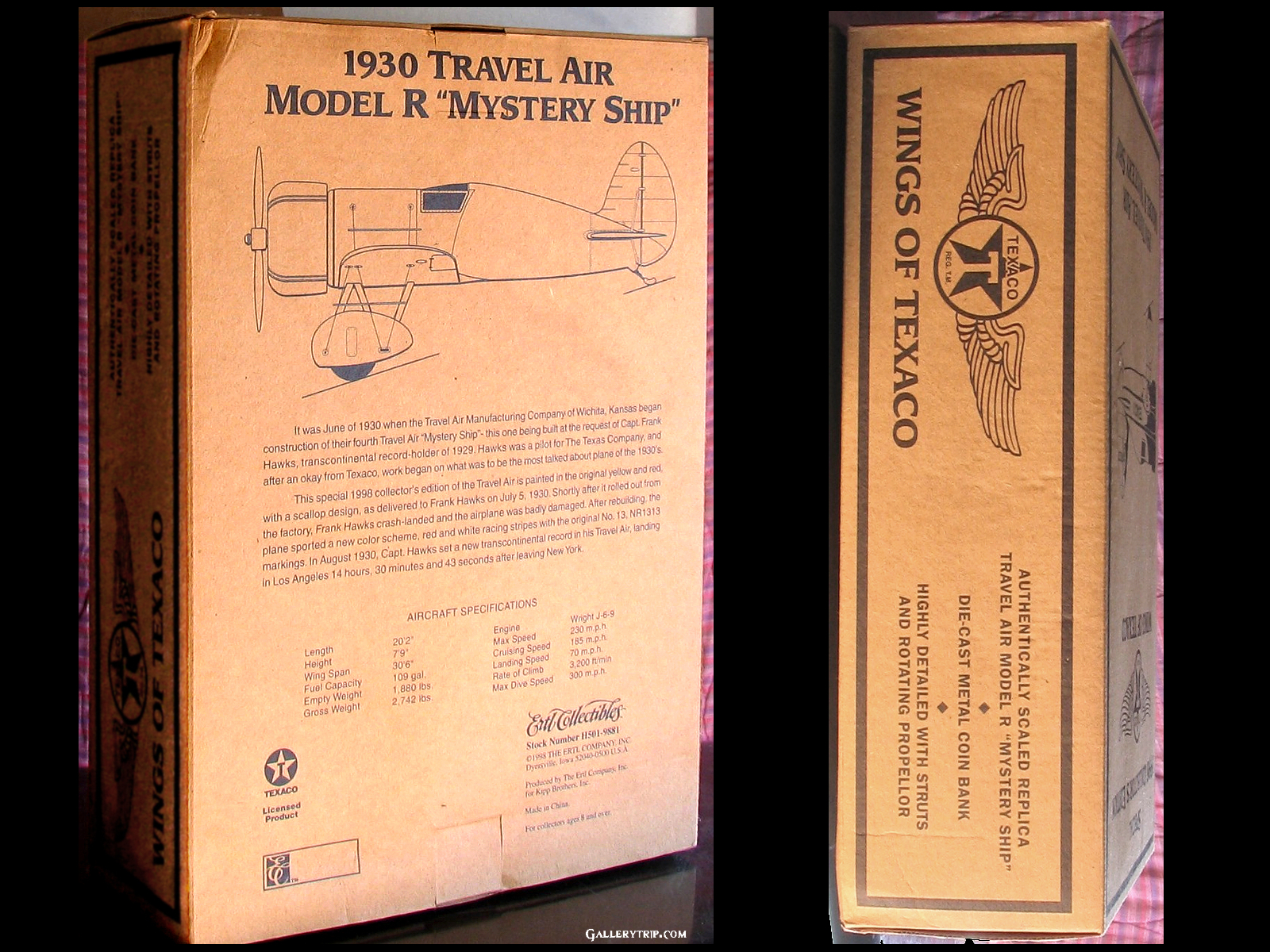 A die-cast metal coin bank that’s an authentically scaled replica of a Travel Air model ‘R’ ‘Mystery Ship,’ highly detailed with wing struts and a rotatable prop.